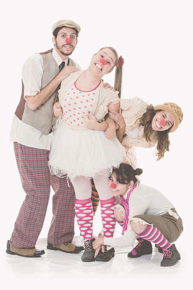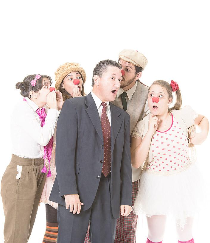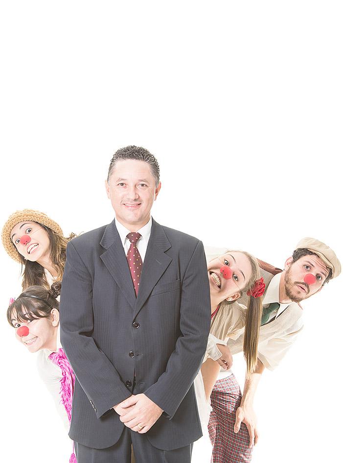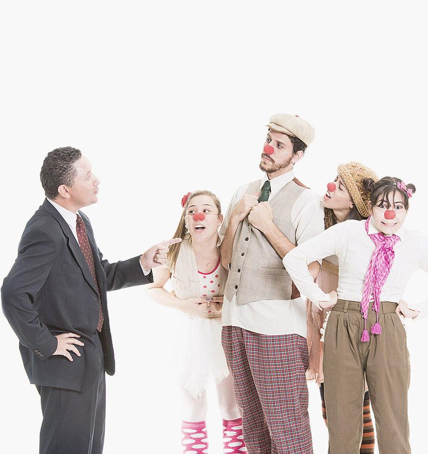 Não pensamos em uma peça de teatro, mas em várias pequenas peças, ou seja, várias esquetes durante a apresentação do conteúdo. Como pensamos em conteúdo personalizado, então pensamos também em esquetes customizadas para o conteúdo. Bem assessorados na área artística, escolhemos do teatro a linha clown.